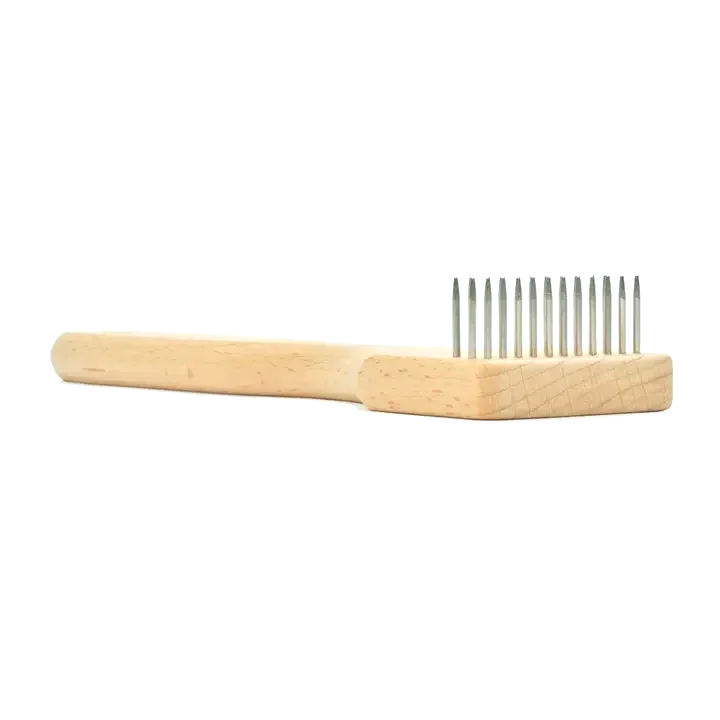 Langhaarkam van beukenhout met metalen tanden. De langhaarkam van robuust beukenhout is een onmisbaar hulpmiddel voor de verzorging van honden met lang haar. Dankzij de ergonomische houten handgreep ligt hij prettig in de hand en maakt hij een precieze en zachte vachtverzorging mogelijk. De stevige metalen tanden glijden moeiteloos door dicht of lang haar, ontwarren knopen en verwijderen losse haren. Tegelijkertijd worden vuildeeltjes en ondervacht betrouwbaar uitgekamd. Regelmatig kammen voorkomt klitten en zorgt ervoor dat de vacht gezond, verzorgd en glanzend blijft.