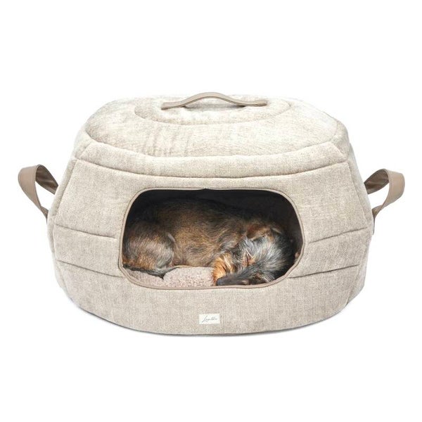 De robuuste meubelstof in beige maakt de hondenhol duurzaam, ongevoelig en onderhoudsvriendelijk. De bodem is gemaakt van stevig, veganistisch leer en zorgt voor extra stabiliteit. Het product is Oeko-TEX® Standard 100 gecertificeerd – alle materialen zijn getest op schadelijke stoffen en zijn veilig voor de gezondheid.