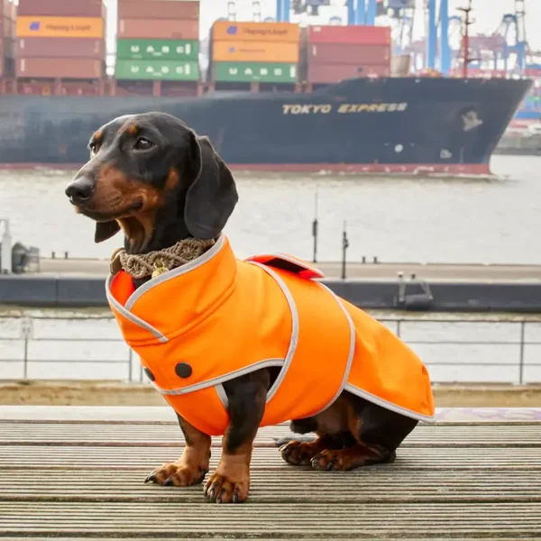 Gemaakt van hoogwaardig softshell-materiaal, zit hij altijd comfortabel dankzij de uitstekende pasvorm en de klittenbandsluiting op de rug. Met een opening voor het harnas op de rug is deze uitstekend afgewerkte hondenjas bovendien gericht op het comfort en de functionaliteit van uw teckel. Het hoogfunctionele softshell-materiaal is daarbij zowel winddicht als waterafstotend, evenals robuust en duurzaam – precies zoals het hoort voor een hoogwaardige softshell-jas.