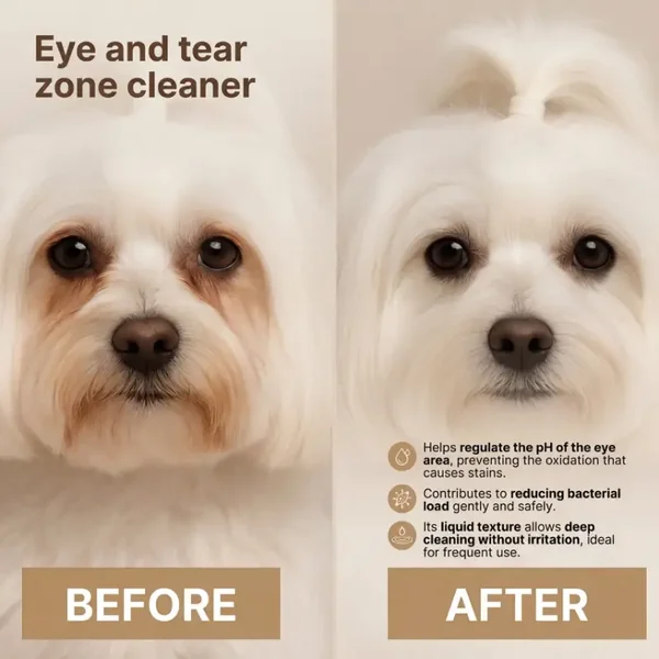 Deze reiniger helpt de pH van het ooggebied te reguleren, wat oxidatie voorkomt die die vervelende bruine vlekken veroorzaakt. Bovendien helpt het de bacteriële belasting op een zachte manier te verminderen, waardoor irritaties en nare geurtjes worden vermeden. De vloeibare textuur vergemakkelijkt een diepe reiniging zonder overmatig wrijven, zodat het proces comfortabel is voor zowel je huisdier als voor jou.